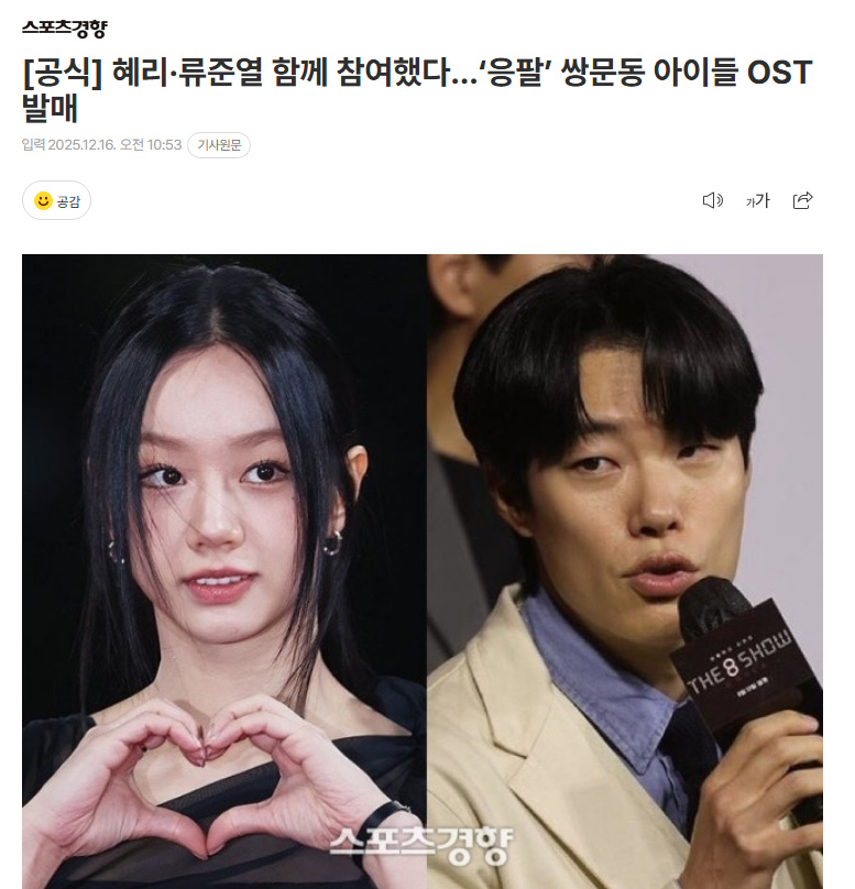 另一方面,“《请回答1988》10周年”综艺节目将于19日通过tvN首播,同日下午6点,OST Part 1也将在各大音源网站同步上线。