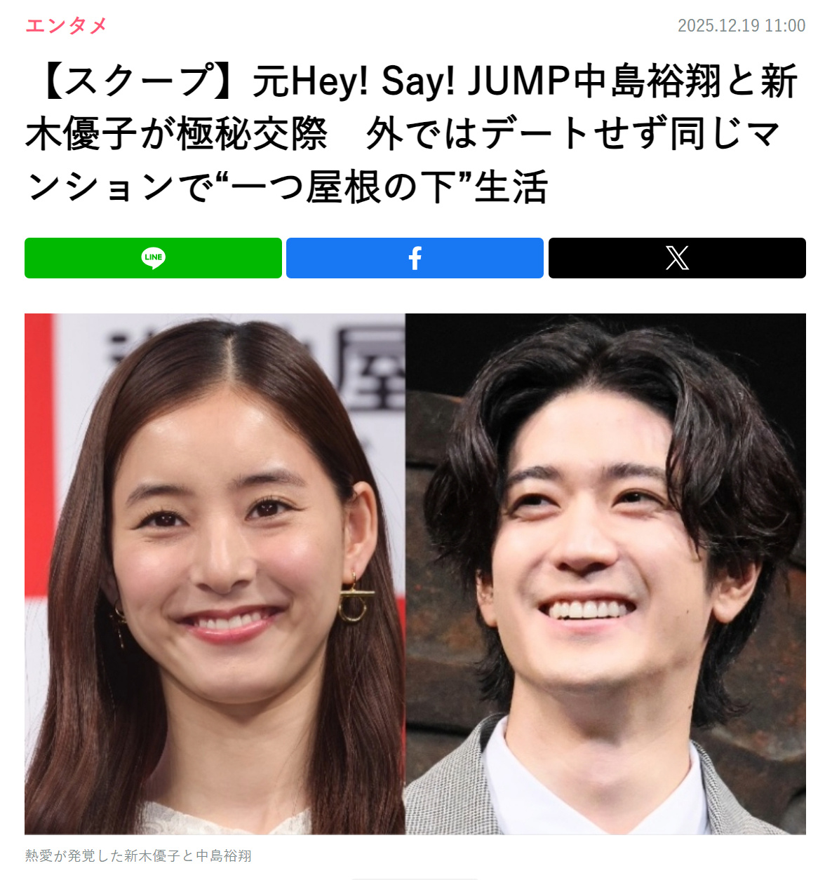 中国娱乐网讯 www.yule.com.cn 据日本杂志《女性SEVEN》报道,前Hey! Say! JUMP成员中岛裕翔(32岁)与女演员新木优子(32岁)正在热恋中,且关系已发展到极为亲密的阶段,两人不仅频繁进行“居家约会”,更传出已迁入同一栋公寓,开始类似“半同居”的生活。