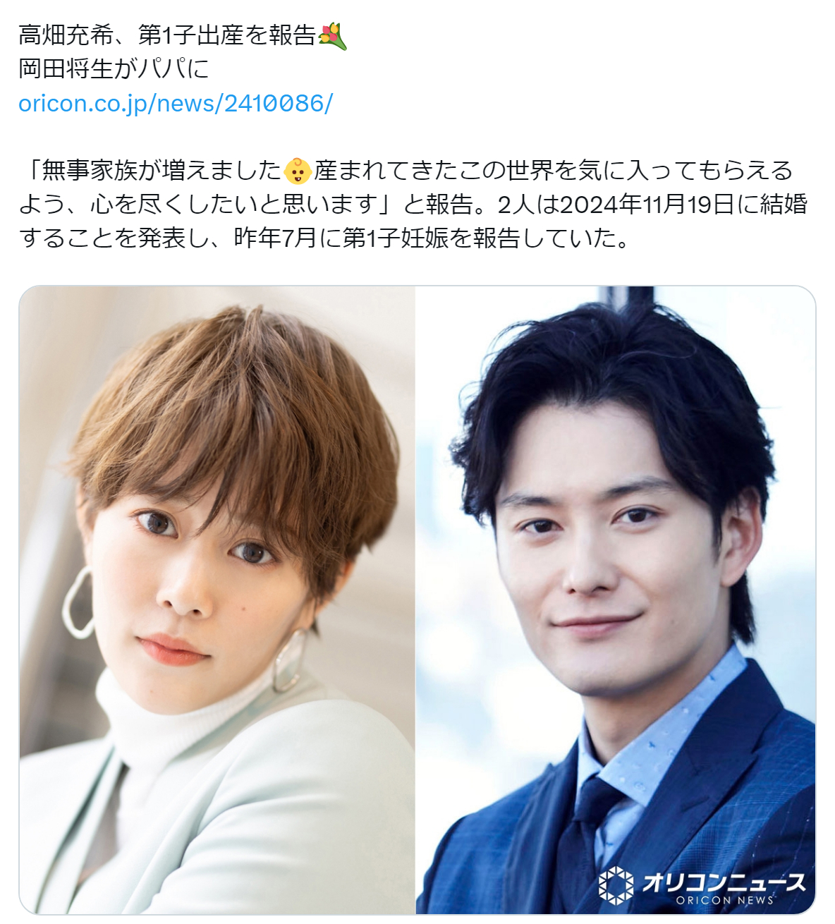 中国娱乐网讯 www.yule.com.cn 据日媒1月28日报道,日本演员高畑充希与冈田将生正式官宣诞下第一胎,喜得贵子。两人通过官方渠道发表声明:"希望能尽我们所能,让孩子爱上这个降生的世界。"这温馨的话语中充满初为人父人母的喜悦与期待。