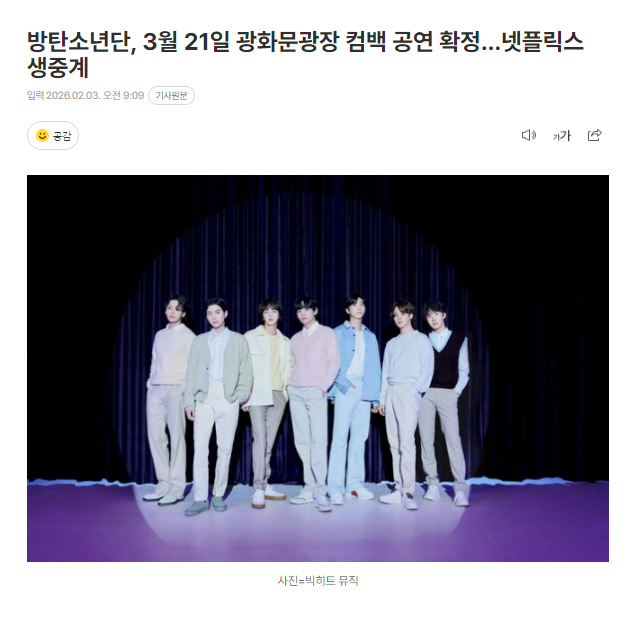 “BTS THE COMEBACK LIVE|ARIRANG”将与Netflix合作进行。这是韩国举办的大型活动首次通过Netflix向全球190多个国家和地区的观众进行实时直播。防弹少年团的回归舞台计划成为连接全世界的大规模活动,再次证明了组合的全球影响力。