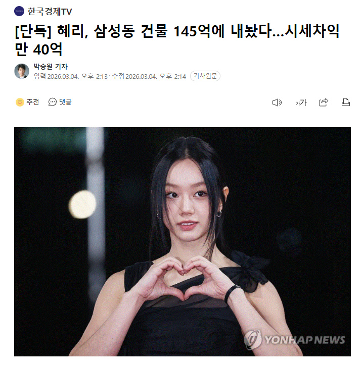 中国娱乐网讯 www.yule.com.cn 据房地产业界4日透露,Girl's Day成员兼演员惠利上月以145亿韩元的价格,成功出售位于首尔江南区三成洞的一栋建筑。