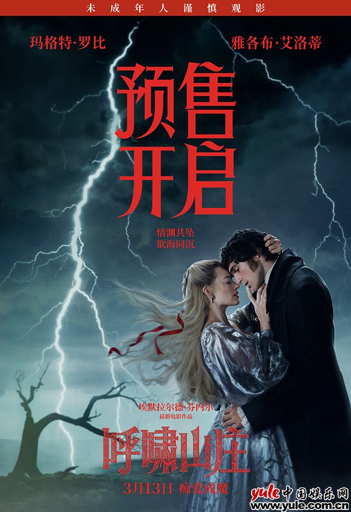 中国娱乐网讯 www.yule.com.cn 由好莱坞巨星玛格特·罗比、雅各布·艾洛蒂领衔主演的电影版《呼啸山庄》(Wuthering Heights) 今日发布预售海报和预告,宣布正式开启预售。海报中,荒原之上电闪雷鸣,凯茜(玛格特·罗比 饰)与希斯克利夫(雅各布·艾洛蒂 饰)深情相拥。电影《呼啸山庄》改编自英国著名作家艾米莉·勃朗特的同名经典文学作品,埃默拉尔德·芬内尔执导,玛格特·罗比担任制片人。影片风格现代新锐,视觉呈现精致考究,原声配乐独具匠心,将为观众奉上一场震撼人心的视听盛宴,3月13日正式全国上映。