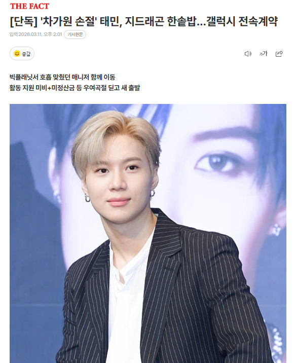 中国娱乐网讯 www.yule.com.cn 11日据独家报道,泰民最近与GALAXY CORP签订了专属合约。GALAXY CORP是歌手权志龙、金钟国、演员宋康昊的所属社。由于Big Planet Made无法结清超过10亿韩元的结算金等原因,泰民今年2月底与所属社中途解约,并迅速找到了新所属社。