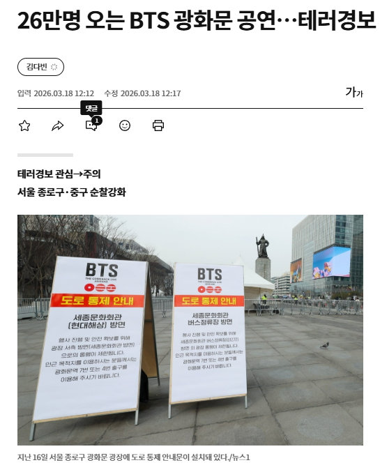 据国务调整室18日消息,针对21日举行的BTS光化门公演,政府决定于19日0时至21日午夜,将首尔钟路区、中区一带的恐怖警报等级从“关注”上调至“注意”。韩国的恐怖警报共分为“关注→注意→警戒→严重”四个等级,此次上调是基于近期不稳定的国际局势以及大型活动中人群密集可能存在的潜在威胁而采取的提前预防措施。