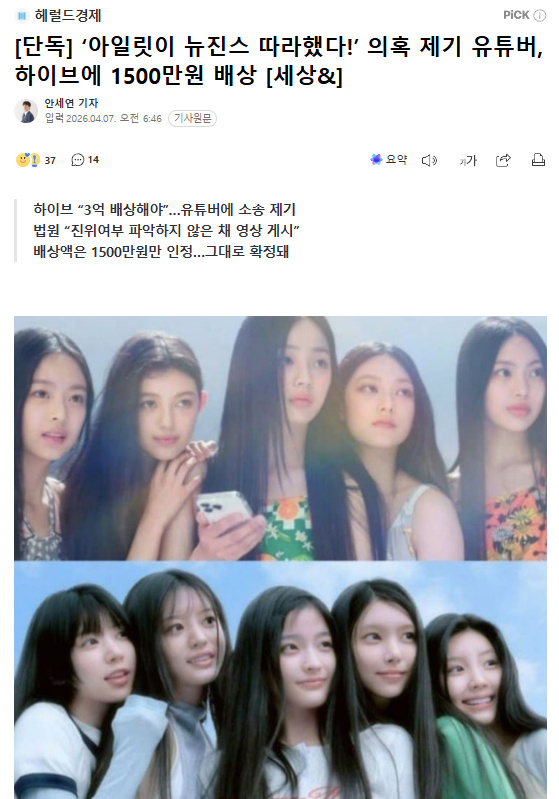 一审法院判决HYBE胜诉,认为A某上传虚假视频确实损害了HYBE名誉。裁判部指出:“从A某提交的报道来看,只有因剽窃攻防战而引起争议的内容,没有可以认定ILLIT剽窃NewJeans编舞的资料。A某在没有正确掌握真伪的情况下上传了相关视频。”法院还引用了2024年10月NewJeans与ADOR专属合约有效的判决,其中记载“综合提交的证据,很难承认NewJeans成员HANNI从ILLIT经纪人处听到‘无视她’的事实”。对于A某贬低ILLIT实力的视频,法院表示“这确实是诽谤HYBE和ILLIT的内容。相关视频点击量少则10万、多则800万,确实损害了HYBE名誉或妨碍了业务。”
