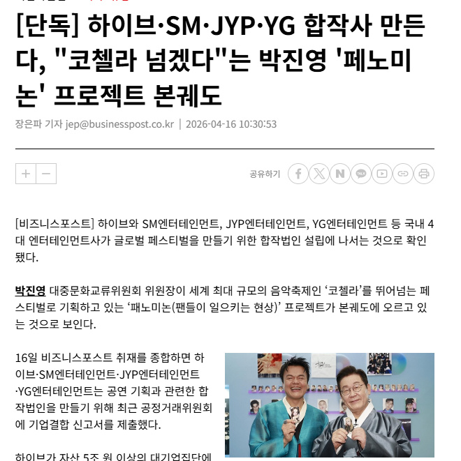中国娱乐网讯 www.yule.com.cn 经确认,韩国四大娱乐公司——HYBE、SM、JYP、YG已着手设立合资法人,合力打造全球性音乐庆典。大众文化交流委员会委员长朴振英规划的“Fannomenon”项目,旨在打造超越科切拉的大型演出活动,目前已正式推进落地。