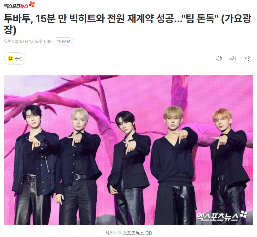 中国娱乐网讯 www.yule.com.cn 17日播出的《李恩智的歌谣广场》中,TXT公开了组合在15分钟内完成全员续约的幕后故事。队长秀彬表示:“我们约好了日子会面,并在约定的那天晚上聚在了一起。我还以为会花费很长的时间。当时我问了各种各样的问题,都得到了同样的回答,全部都表示‘同意’。就这样顺利进行了续约。续约顺利到连有趣的事情都没有发生。”