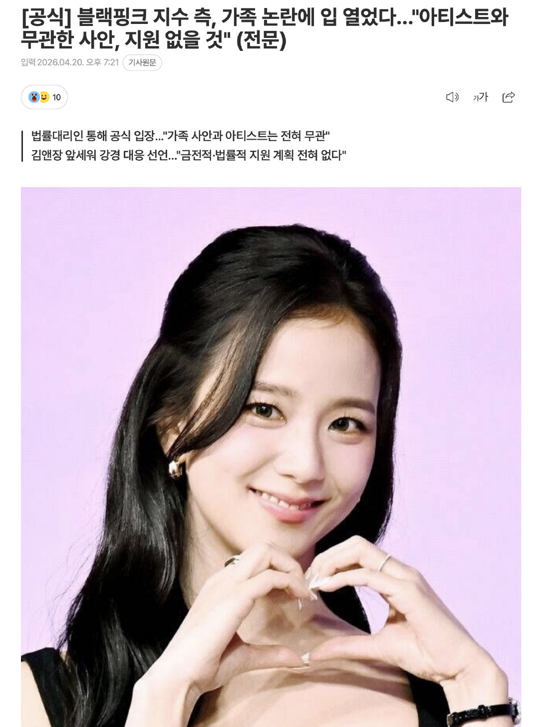 声明指出,金智秀自幼年开始练习生生活,早早独立,长期与家人分离,对于相关人物的私生活并不知情,亦无法介入。在BLISSOO设立筹备过程中,金智秀曾得到家庭成员作为有限的建议及对话传递方面的帮助,但从当时至今,家庭成员从未从BLISSOO收取过报酬,也从未参与过决策。此后,公司与家庭成员完全无关,独立运营。声明特别澄清,部分媒体及网络上传播的“该人物与艺人携手共同设立”“该人物为BLISSOO的管理人员或代表理事”等内容完全不属实,该人物目前与BLISSOO不存在任何法律或经营上的关系。