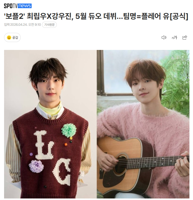 FLARE U是由去年播出的Mnet《Boys 2 Planet》中实力和潜力得到认可的崔立于、姜玗进组成的二人组。两人在节目中凭借扎实的舞台表现和鲜明的个人魅力积累了大量粉丝,此次以双人组合形式出道备受瞩目。据悉,出道专辑正在积极筹备中,成员们亲自参与了音乐制作与视觉企划,力求展现独特的双人化学反应。他们还将出演5月在日本举行的《KCON JAPAN 2026》,首次登上大型音乐舞台与海外粉丝见面。随着出道日期临近,更多关于FLARE U的专辑概念及活动计划将陆续公开。
